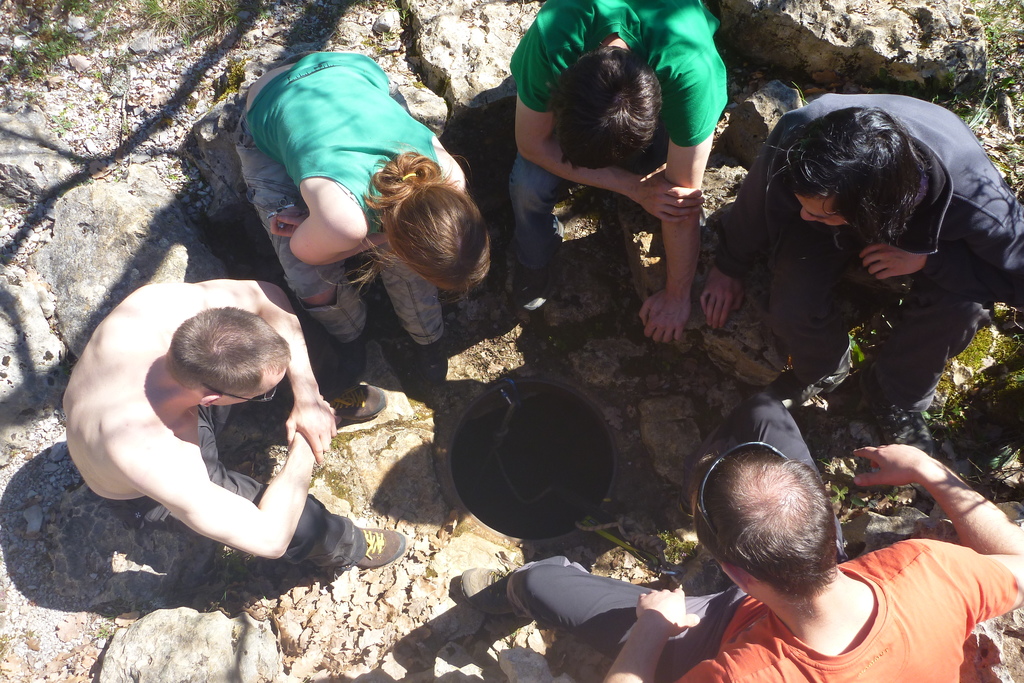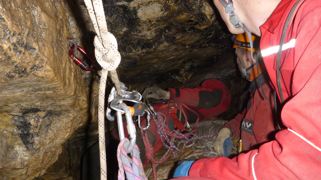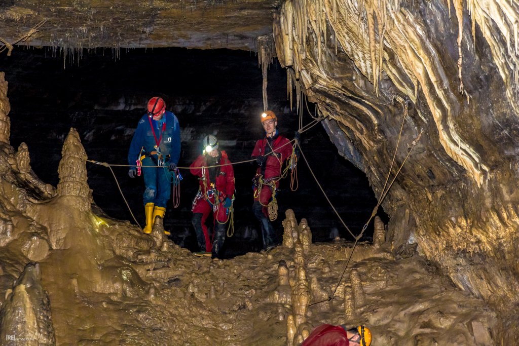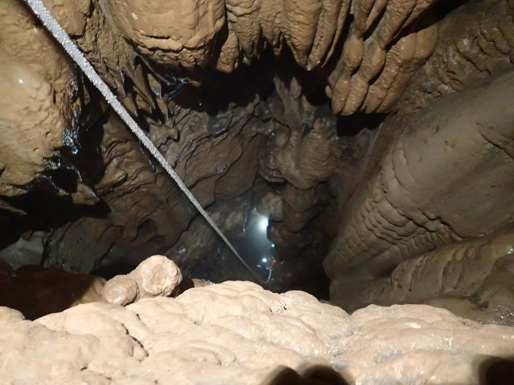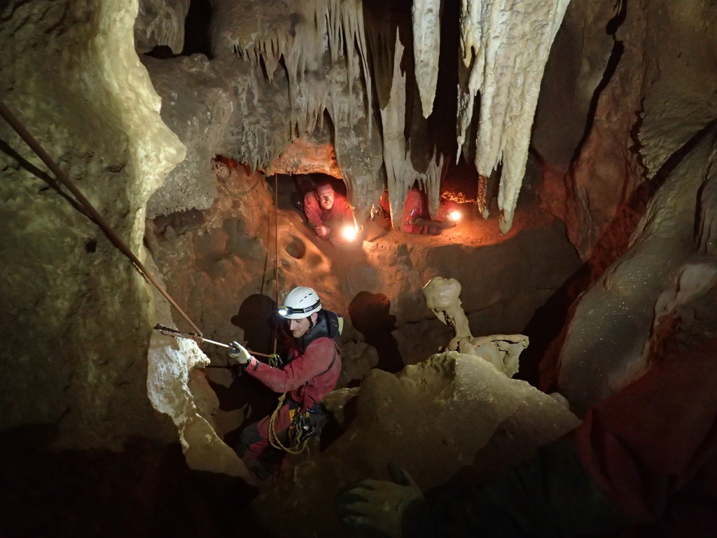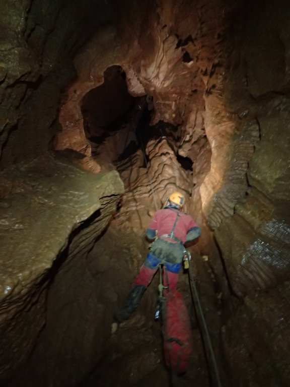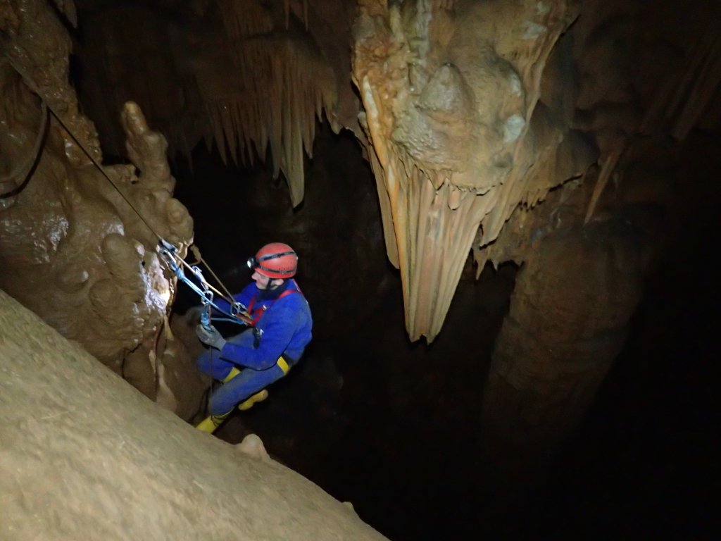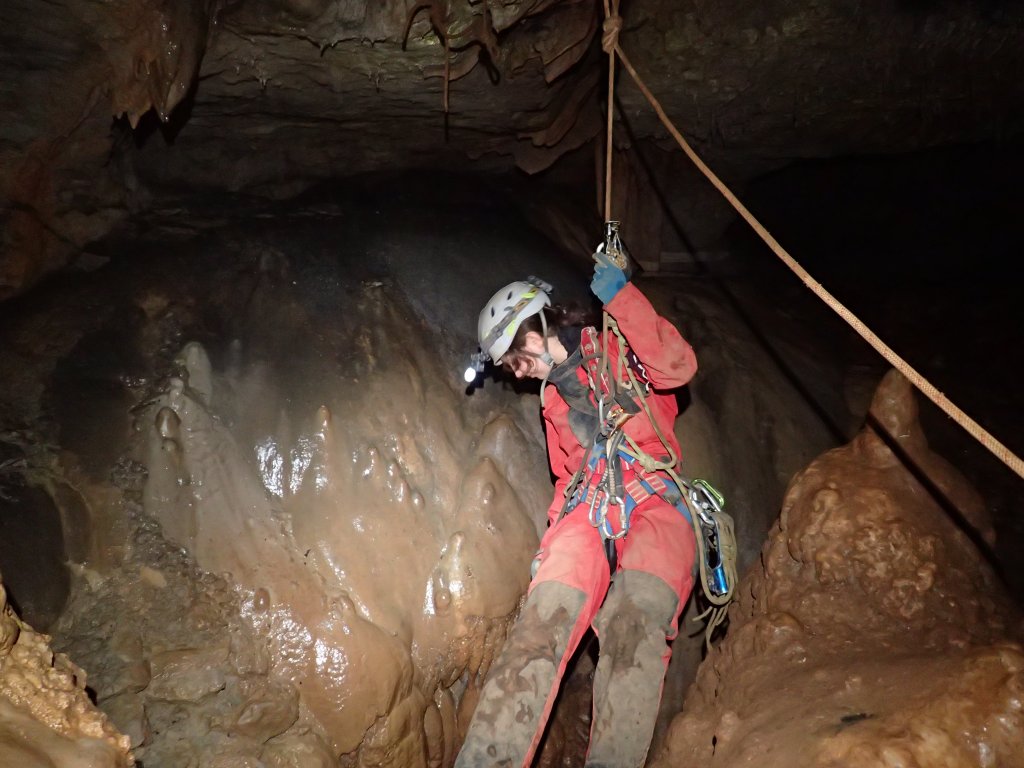 Nicht nur Wasserhöhlen, sondern auch viel Schacht standen in diesem Jahr auf dem Programm. Mit der ganzen Gruppe konnten wir u.a. die Aven des Oublis befahren, die sich ab dem ersten Schachtboden in einen Bereich mit großen Räumen und sehnswertem Tropfstein, und einen zweiten Schachtabschnitt aufteilt. Perfekt auch für eine etwas größere Gruppe, bei der man sich am Schachtkopf immer mal wieder begegnet. Oberhalb des malerischen Örtchens Tharaux und der Cèze gelegen, ist allein der Zustieg eine Reise wert. Aber auch in kleineren, geteilten Gruppen konnten wir tiefere Schachthöhlen befahren; nach vielen Jahren mal wieder mit einen Blick in die Aven du Marteau und zeitgleich in das System Rochas–Midroï werfen. Leider war der komplette Durchstieg zur Midroï, und damit auf Flussniveau der Ardèche, am Ende durch 20 fehlende Seilmeter knapp verwehrt, reizt aber umso mehr für die kommenden Jahre.