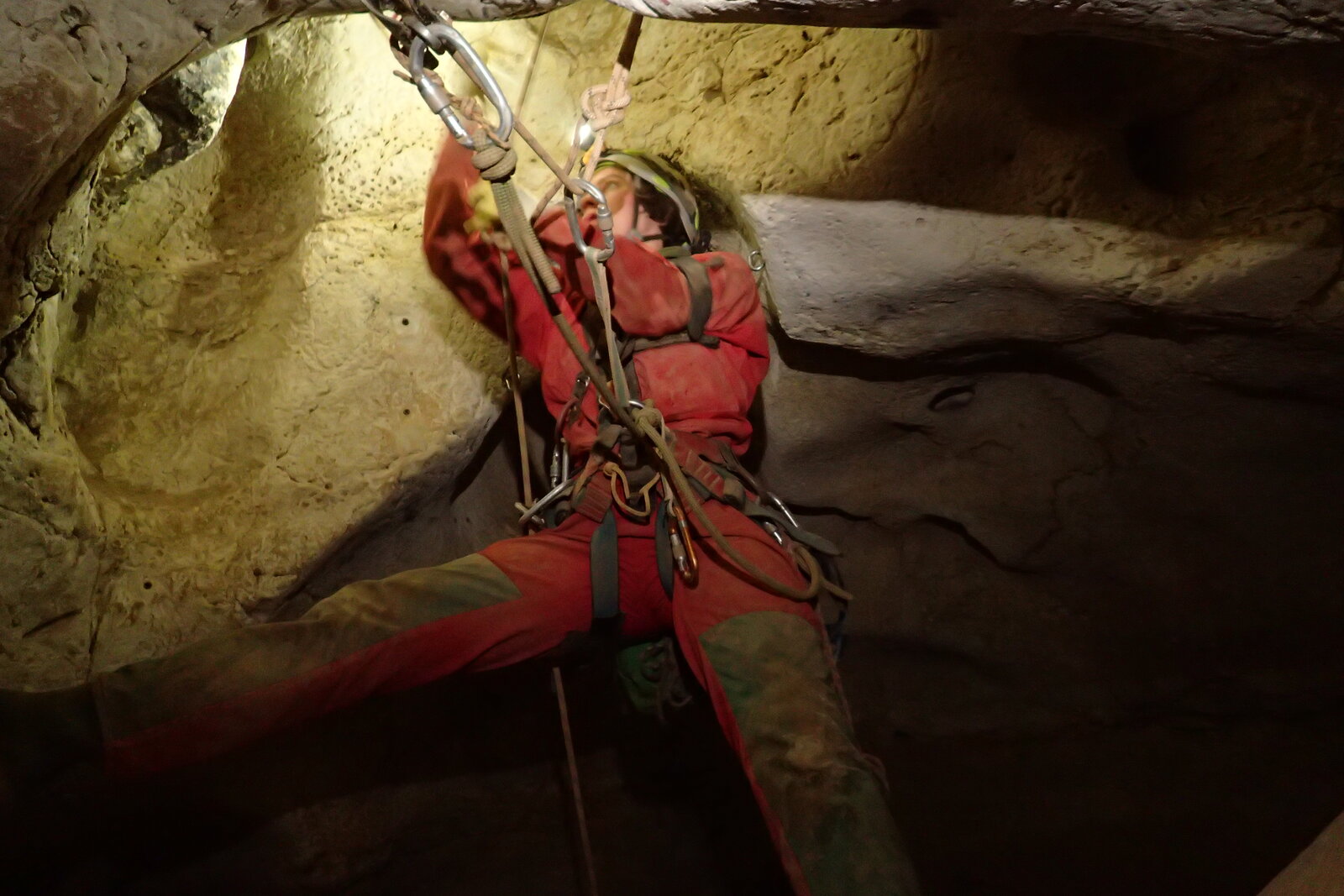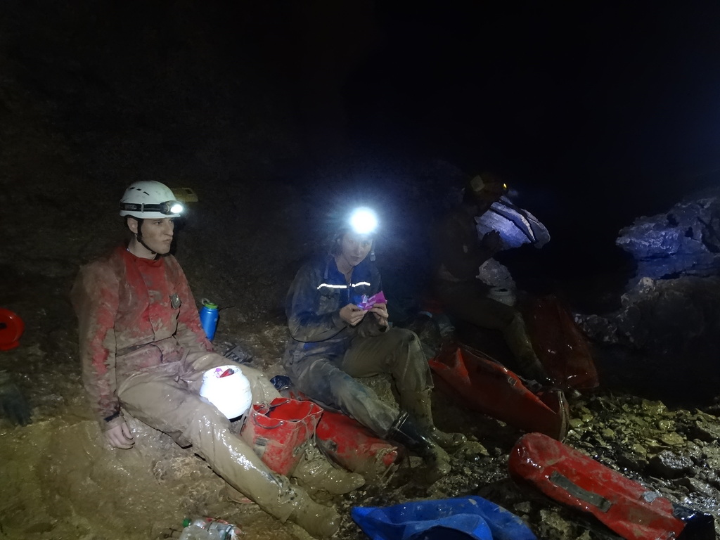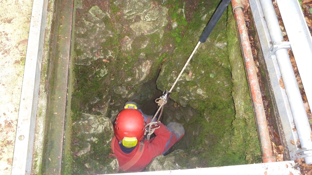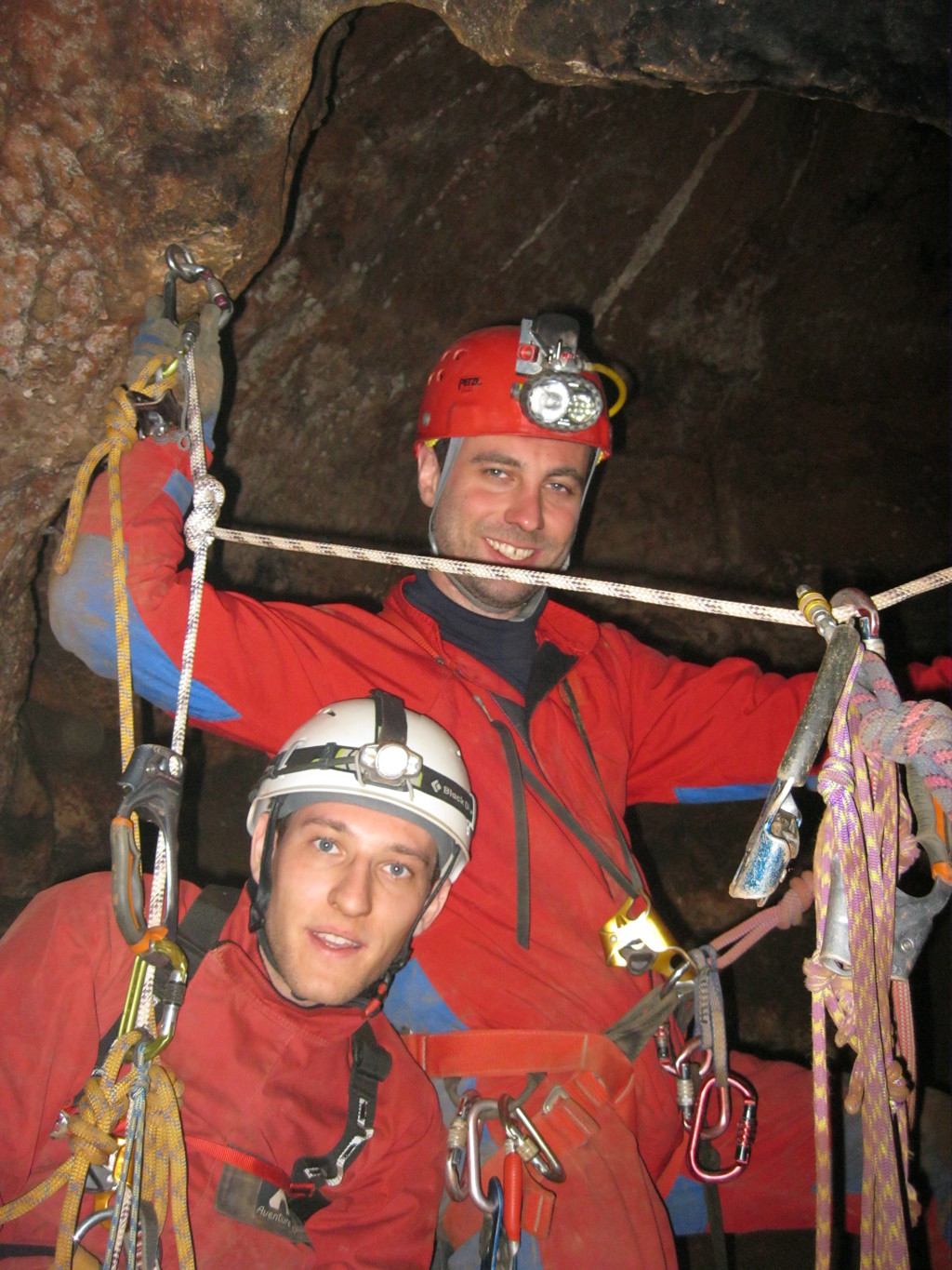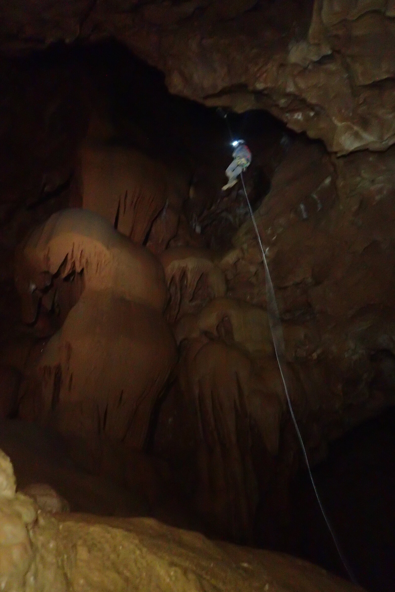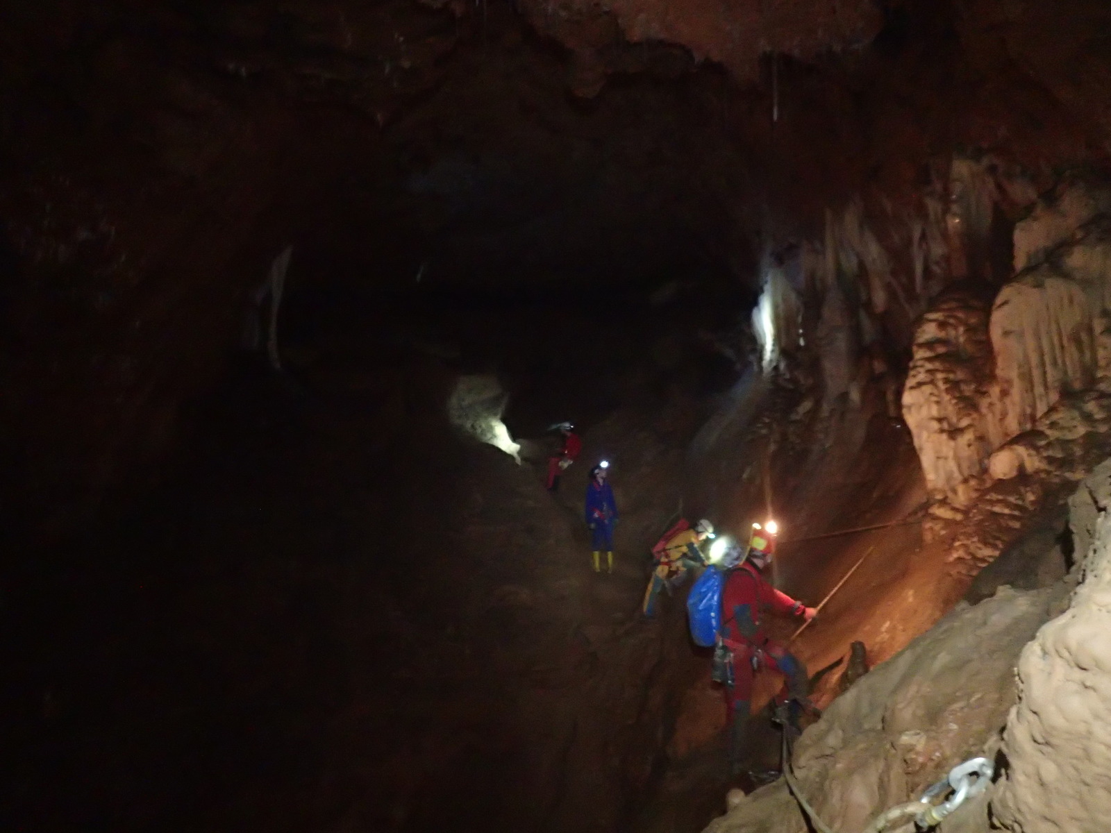 Nicht nur Wasserhöhlen, sondern auch viel Schacht standen in diesem Jahr auf dem Programm. Mit der ganzen Gruppe konnten wir u.a. die Aven des Oublis befahren, die sich ab dem ersten Schachtboden in einen Bereich mit großen Räumen und sehnswertem Tropfstein, und einen zweiten Schachtabschnitt aufteilt. Perfekt auch für eine etwas größere Gruppe, bei der man sich am Schachtkopf immer mal wieder begegnet. Oberhalb des malerischen Örtchens Tharaux und der Cèze gelegen, ist allein der Zustieg eine Reise wert. Aber auch in kleineren, geteilten Gruppen konnten wir tiefere Schachthöhlen befahren; nach vielen Jahren mal wieder mit einen Blick in die Aven du Marteau und zeitgleich in das System Rochas–Midroï werfen. Leider war der komplette Durchstieg zur Midroï, und damit auf Flussniveau der Ardèche, am Ende durch 20 fehlende Seilmeter knapp verwehrt, reizt aber umso mehr für die kommenden Jahre.